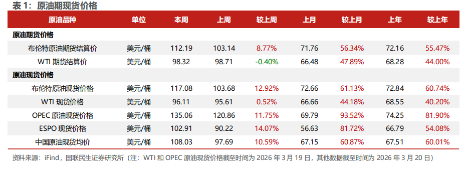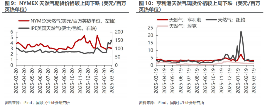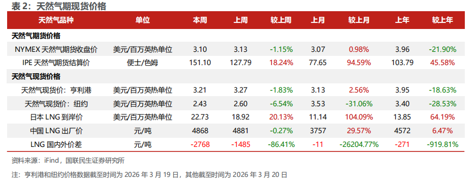 美元指数下降;布油价格上涨;东北亚LNG到岸价格上涨。截至3月20日,美元指数收于99.51,周环比-0.98个百分点。1)原油方面,布伦特原油期货结算价为112.19美元/桶,周环比+8.77%;WTI期货结算价为98.32美元/桶,周环比-0.40%。2)天然气方面,NYMEX天然气期货收盘价为3.10美元/百万英热单位,周环比-1.15%;东北亚LNG到岸价格为22.73美元/百万英热,周环比+20.13%。