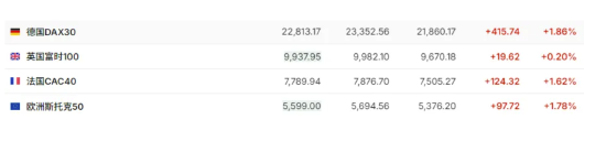 此外,欧洲股市全线拉升转涨 。此前,德国DAX30指数、英国富时100指数、法国CAC40指数、欧洲斯托克50指数均跌超2%。