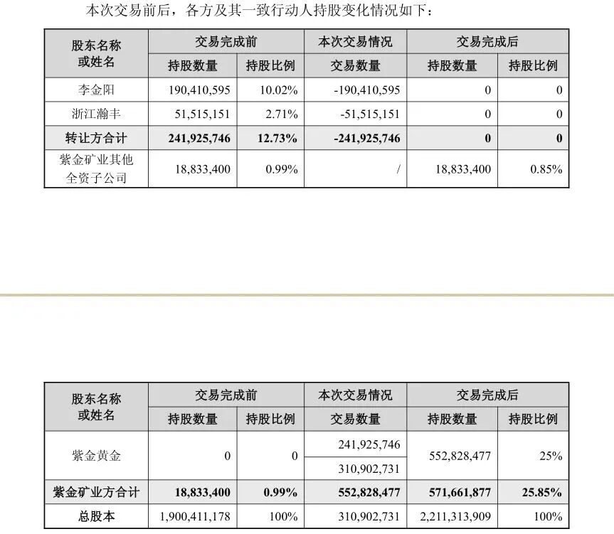 交易完成后,李金阳、浙江瀚丰创业投资合伙企业(有限合伙)不再持有赤峰黄金的股份,赤峰黄金控股股东将由李金阳变更为紫金黄金集团,赤峰黄金实际控制人将由李金阳变更为上杭县财政局,紫金矿业方面的持股比例将达到25.82%。