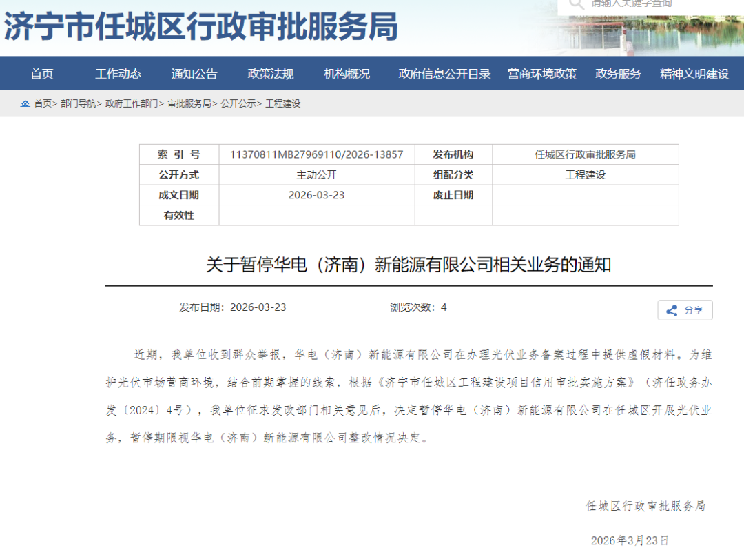 泰山财经记者获悉,3月23日,济宁市任城区行政审批服务局发布《关于暂停华电(济南) 新能源 有限公司相关业务的通知》,决定暂停华电(济南)新能源有限公司(简称“华电济南新能源”)在任城区开展光伏业务,暂停期限视其整改情况而定。