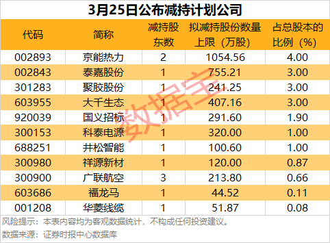 统计显示,今日共11家公司公告股东减持计划,拟减持比例居前的有京能热力、泰嘉股份、聚胶股份、大千生态等。