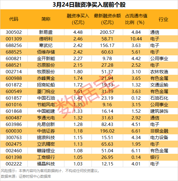 具体到个股,3月24日共有1670只股获融资净买入,净买入金额在千万元以上的有361只,其中21只融资净买入额超1亿元。新易盛融资净买入额居首,当日净买入4.48亿元;其次是德明利、寒武纪,融资净买入金额分别为2.46亿元、2.42亿元;融资净买入金额居前的还有佰维存储、金开新能、芯原股份等。