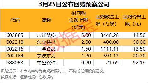 3月25日共有5家公司发布公告,拟进行股份回购,合计回购金额上限近10亿元。回购金额最高的是吉祥航空,拟回购资金总额2.5亿元—5亿元。