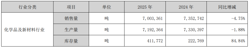 从产销量来看,2025年公司化学品及新材料整体销售量同比下降4.75%至700.34万吨,生产量同比下降1.88%至719.24万吨,而期末库存量则同比大增84.84%,达到41.18万吨。销售量下滑而产量调整滞后,导致公司进入被动累库阶段,这也从侧面印证了下游需求偏弱与供给端产能释放带来的短期供需错配压力。