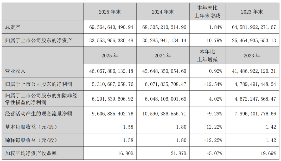 慧正资讯,2026年3月24日,卫星化学披露2025年度年度报告。公告显示,2025年,卫星化学总资产695.65亿元,同比增长1.84%;营业总收入460.68亿元,同比增长0.92%;归母净利润53.11亿元,同比下滑12.54%;扣非后归母净利润为62.92亿元,同比增长4.02%,每股收益为1.58元。此外,公司拟向全体股东每10股派发现金红利5.00元,预计分红总额16.78亿元,延续了稳健回报的分红传统。