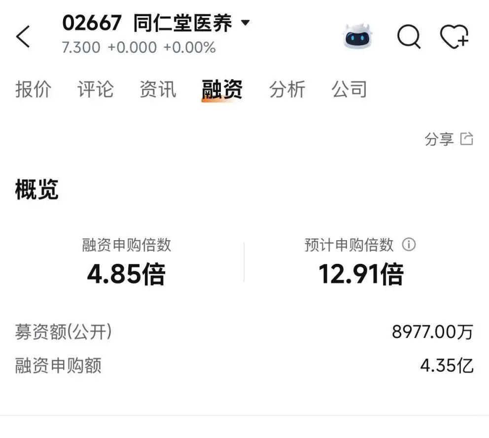 而从申购数据来看也确实如此,本次新股申购中,同仁堂医养的申购数据并不太理想。富途牛牛的申购数据显示,其融资申购倍数仅有4.85倍,这一倍数表明其在散户认购中并不积极。(注:富途牛牛相关融资倍数与最终数据有一定差异)