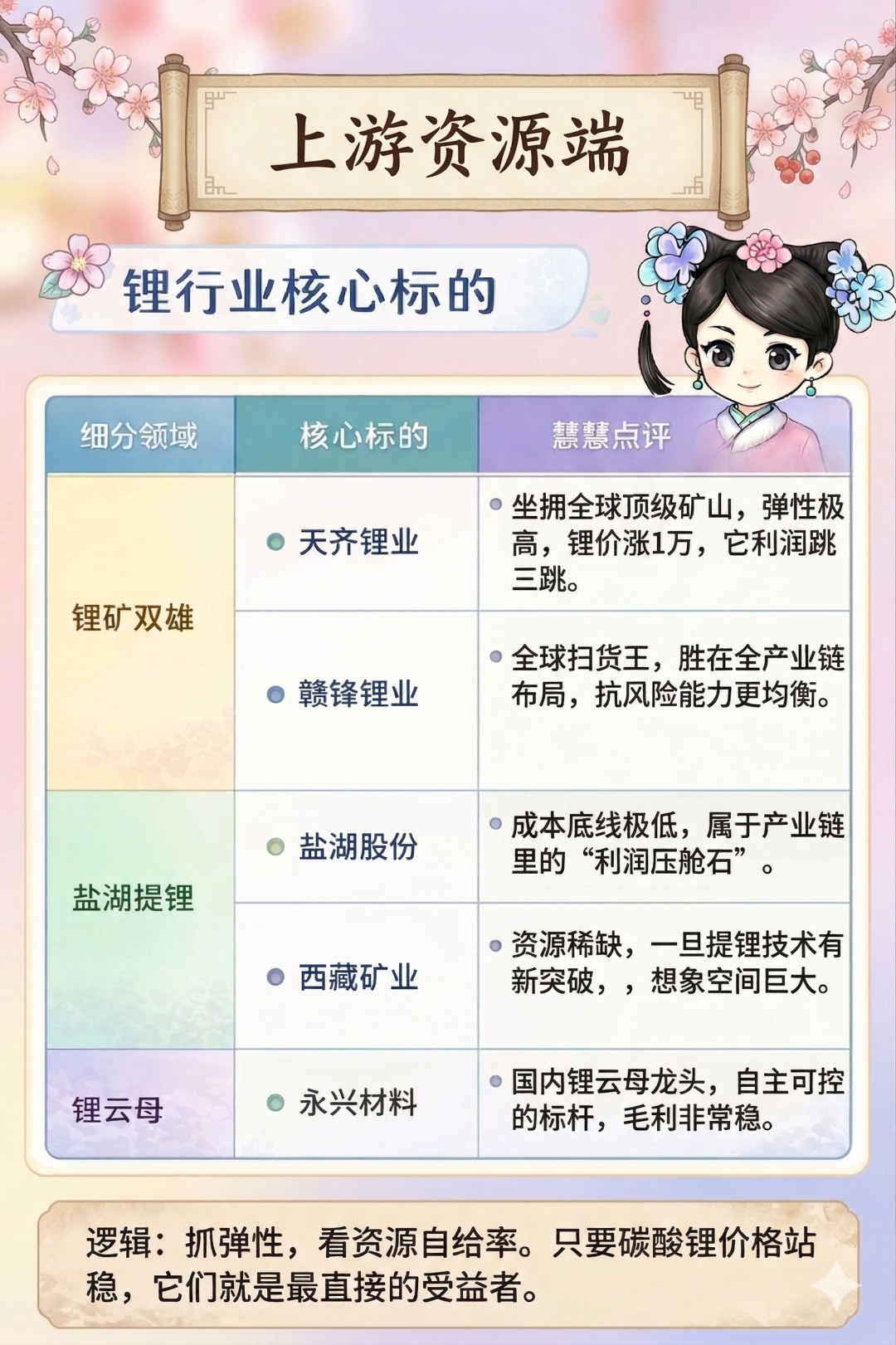 今天A股锂电标的涨得不错,趁着热乎劲儿,谁是家里有矿的真地主,谁是技术过硬的急先锋?慧慧帮大伙儿把核心标盘点一番!