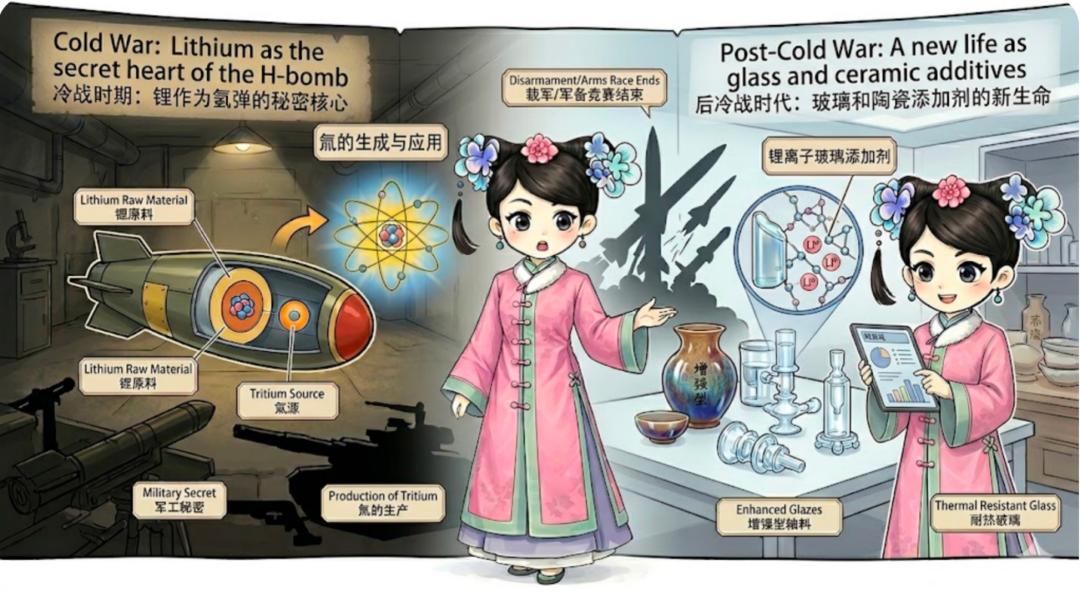 家人们可能不知道,锂最早大放异彩是在冷战时期。那时候它是生产氢弹的原材料(用于转化成氚)。直到1980年代,它都还是军工界的秘密武器,普通人根本接触不到。后来军备竞赛结束,它才委身去做了玻璃和陶瓷的添加剂。