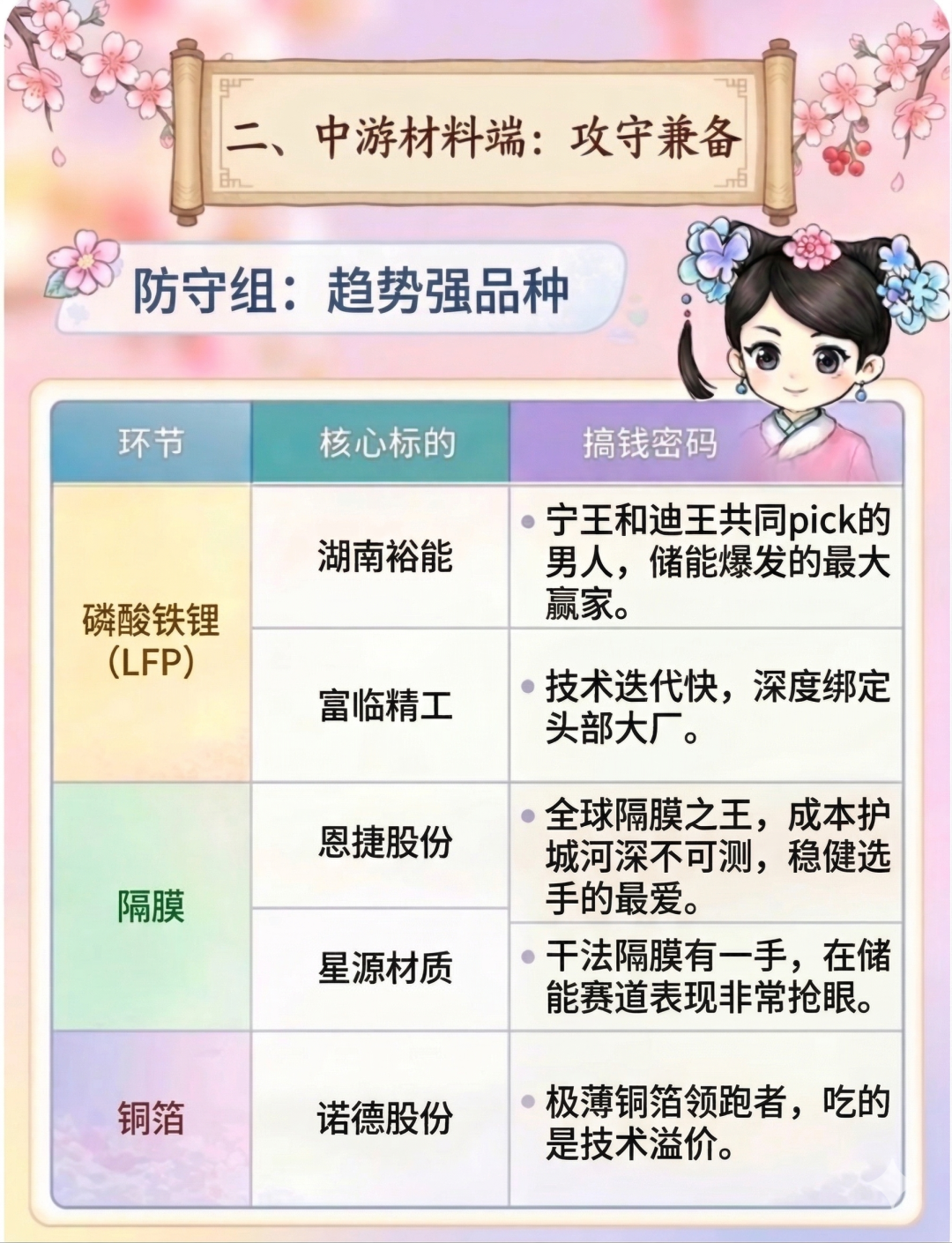 隔膜的恩捷股份:全球隔膜之王,重资产、高门槛。它的成本护城河深不可测,是稳健派选手的“心头好”,只要车在跑、电在存,它就不可或缺。
