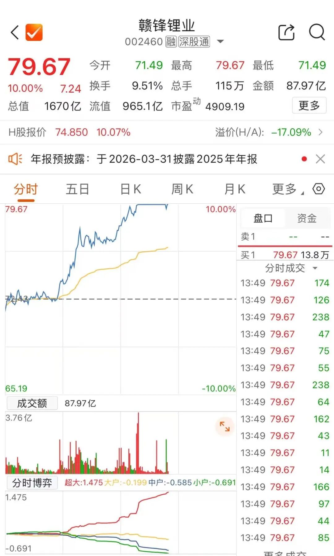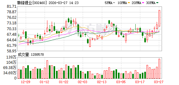 继昨日大涨后,3月27日午后,锂电产业链再度爆发,赣锋锂业涨停,报79.67元/股,总市值达1670亿元。海科新源、川能动力、天原股份、石大胜华、维远股份封上涨停,盐湖股份涨超8%。此前,融捷股份早盘涨停,走出4连板。