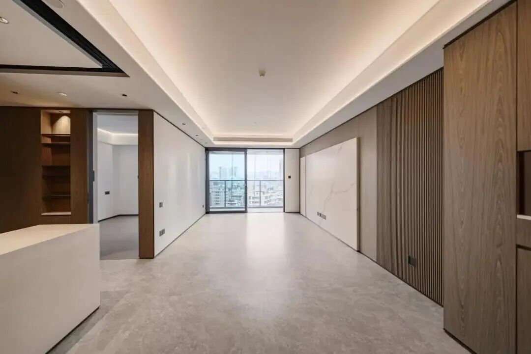 即将启动交付的这批产品中,小户型带精装交付,室内空间通透,交标的木质柜和格栅墙面,沉稳大气。