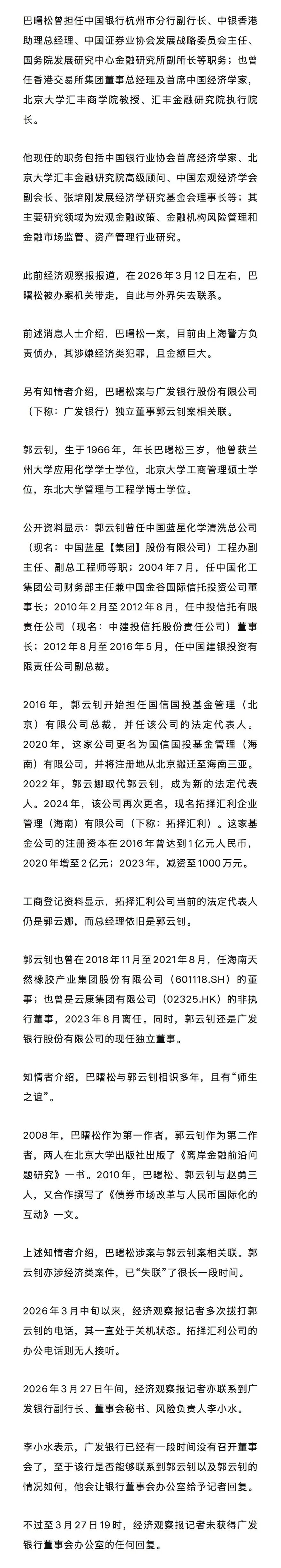 2026年3月25日至27日,数位消息人士向经济观察报记者确认,知名经济学家巴曙松一案,由上海警方负责侦办。巴曙松涉嫌经济类犯罪,且金额巨大。