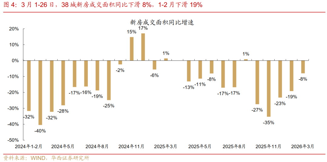 月度趋势来看,本轮“金三”成色依然不足。虽周度环比持续增长,但月度较去年同期相比表现一般,3月1-26日二手房成交面积同比降9%,降幅较1-2月扩大5个百分点。新房同样延续跌势,3月1-26日继续下跌8%,跌幅小于1-2月的19%。分结构来看,3月1-26日,多数城市二手房市 场成交面积同比下滑,深圳、杭州、苏州、成都降幅相对较高,仅扬州同比明显增长。新房市场中,仅广州、武汉同比小幅增长,北京、深圳及部分二三线城市降幅较大。