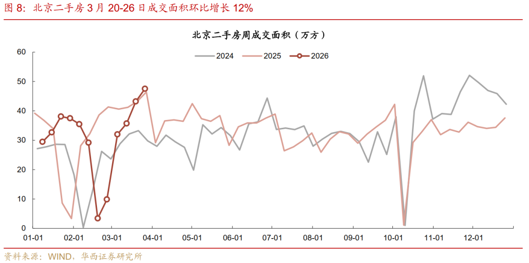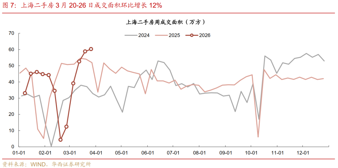 京深表现后来居上,上海的政策提振效应未再进一步扩大。以春节为基准,观察二月初二至二月初八(26年为3月20-26日),与去年农历同期对比,上海二手房成交面积同比增长21%,而北京、深圳同比增幅分别为32%、24%,已高于上海。对比前一周三地分别为+11%、-2%、+5%。增幅分别扩大10pct、33pct、20pct。