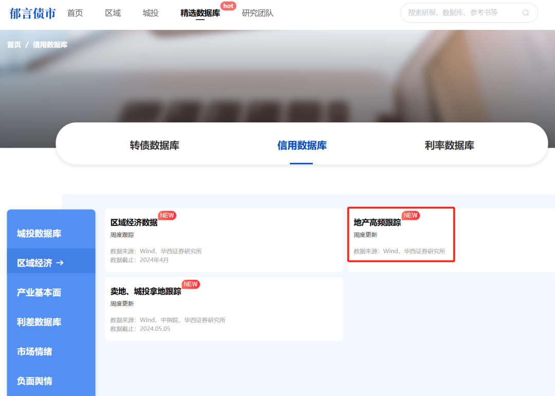 第二步:点击网站首页左上角的精选数据库,在“信用数据库”中的“区域经济”板块,可以下载最新地产销售数据库(周频、月频)。