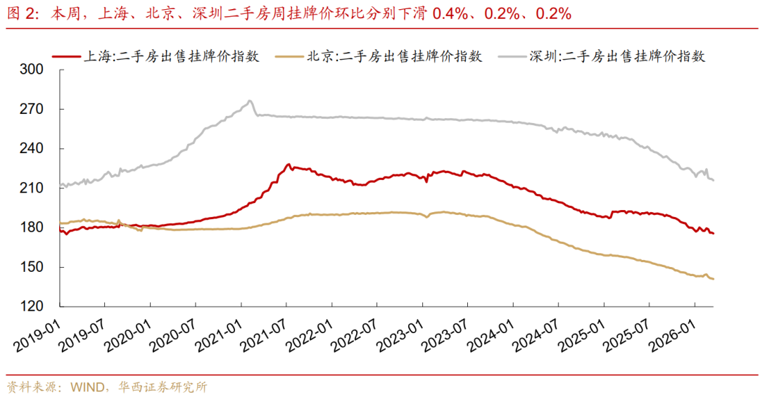 最近一周上海二手房成交面积环比小增2%,此前一周增长14%,仍处爬坡期,不过增速继续放缓。北京与深圳本周分别环比增长10%和6%,相较于上周的高基数(分别环比增长21%和17%),动能同样出现边际回落。
