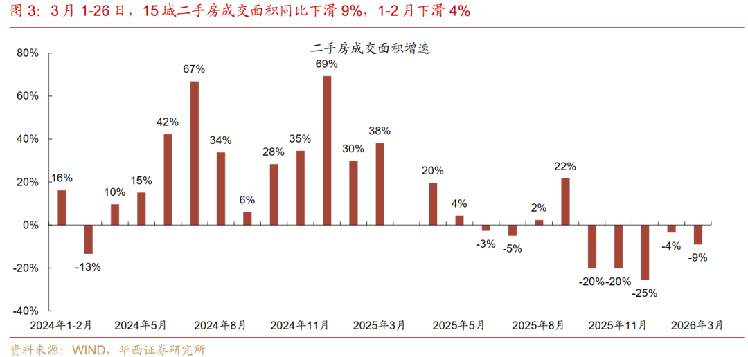 二手房周成交面积周环比连增四周,同比依旧为负但降幅收窄。二手房方面,3月20-26日,15城市二手房成交面积环比增长8%,成交量再创年内新高,同比则小幅下跌3%,跌幅较上周收窄4个百分点。新房环比大增30%,主要二、三线城市(36%、49%)拉动,不过同比仍小幅下滑2%,跌幅较上周收窄6个百分点。