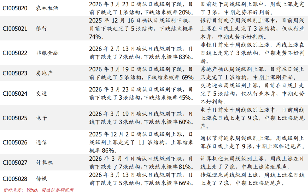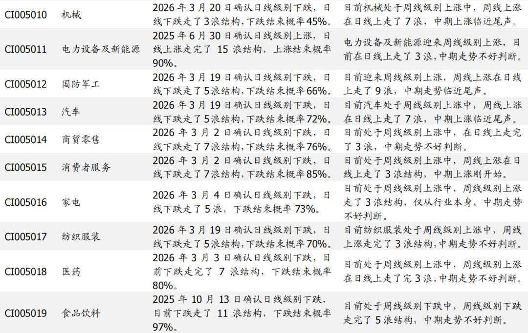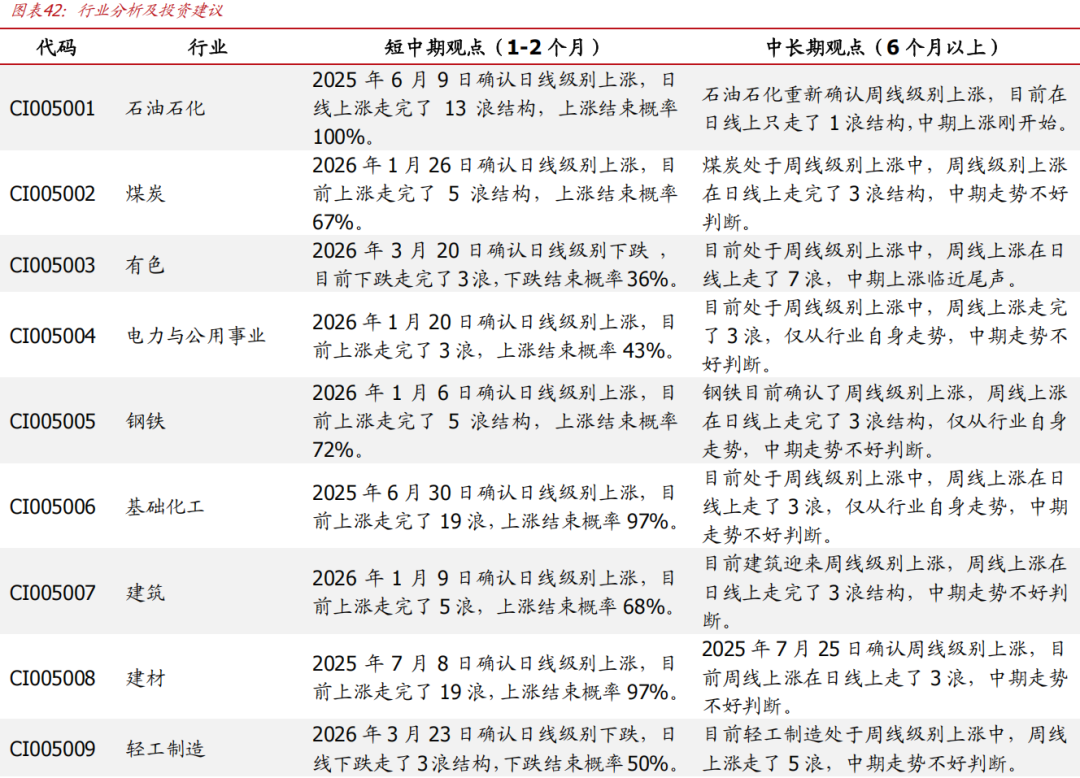 钢铁、医药、化工、农林牧渔、建材、非银、电力设备及新能源、纺织服装已经形成周线级别上涨,并且周线上涨已经走了3浪结构,未来的不确定性在增加,我们将其调出看多行列。