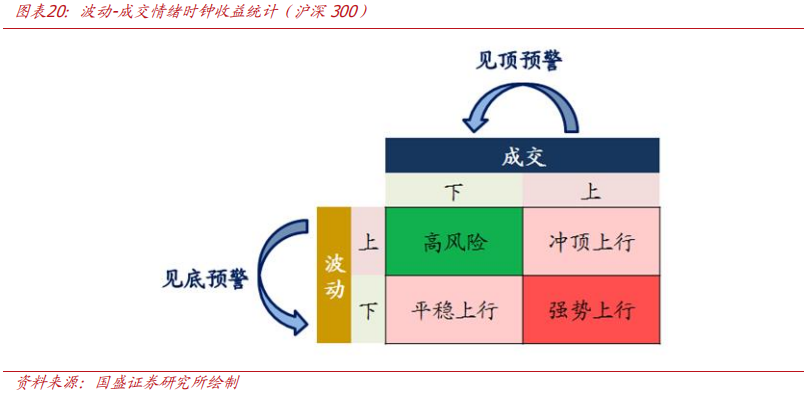 情绪刻画最直接的方式即量价。我们将市场按照波动率和成交额的变化方向划分为四个象限,四个象限中只有:波动上-成交下的区间为显著负收益,其余都为显著正收益。据此我们构造了A股情绪指数(包含见底预警与见顶预警)。