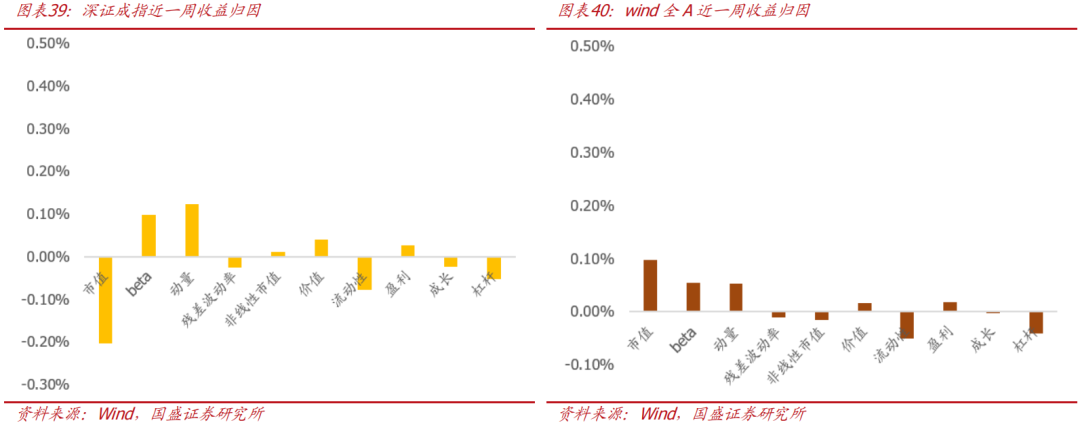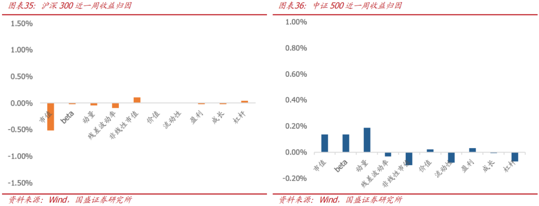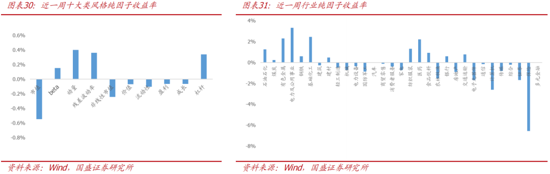 从纯因子收益来看,本周电力及公用事业、化工、有色金属等行业因子相对市场市值加权组合跑出较高超额收益,保险、计算机、农林牧渔等行业因子回撤较多;风格因子中,动量因子超额收益较高,市值呈较为显著的负向超额收益。从近期因子表现来看,高盈利股表现优异,流动性、非线性市值等因子表现不佳。