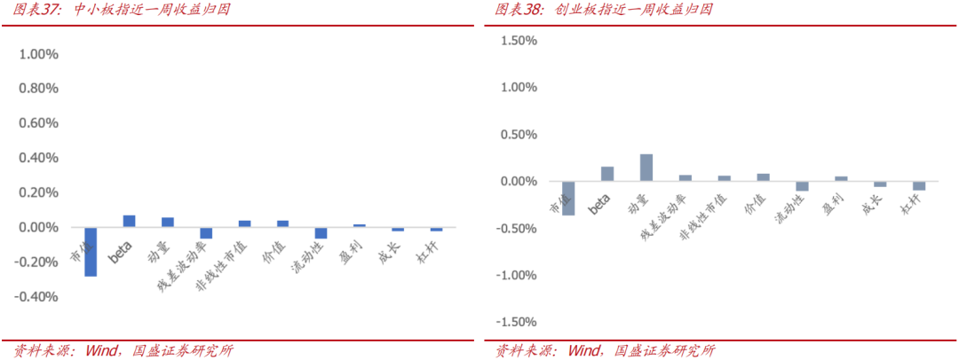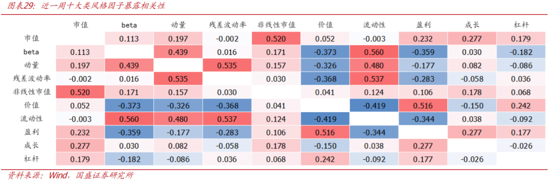 回顾本周市场风格表现,从个股风险暴露相关性来看,流动性因子分别与Beta、动量、残差波动率呈现明显正相关性;价值分别与Beta、残差波动率、流动性等因子呈现明显负相关性。