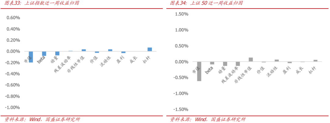指数在不同风格上的收益各有不同。通过对相对于市值加权市场组合的超额收益分解,我们看到,由于近期市场偏好高市值暴露的股票,中证500、Wind全A在市值因子上暴露较大,在风格因子上表现不错;上证50、创业板指在市值因子上暴露较小,本周在风格因子上表现不佳。