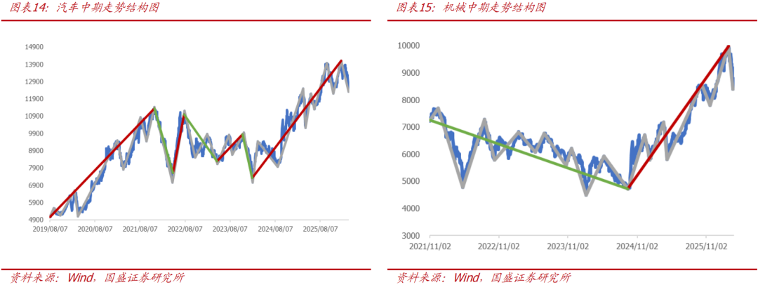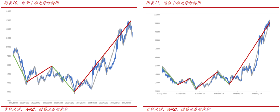 近期,汽车、机械、传媒、计算机、电子、通信、军工、有色的周线级别上涨已经走出了7-9浪结构,处于超涨状态,我们将其列入看空行列。