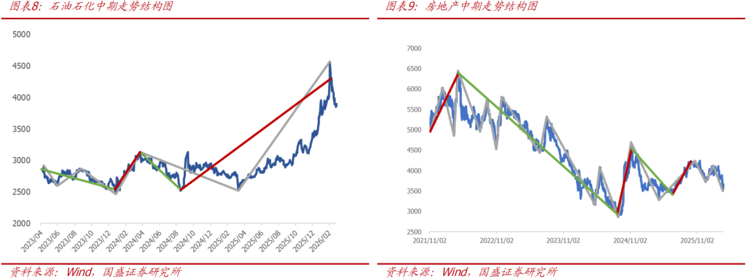 石油石化、房地产目前处于周线级别上涨,而且周线上涨只走了1浪结构,中期上涨刚开始,我们将其纳入看多行列。