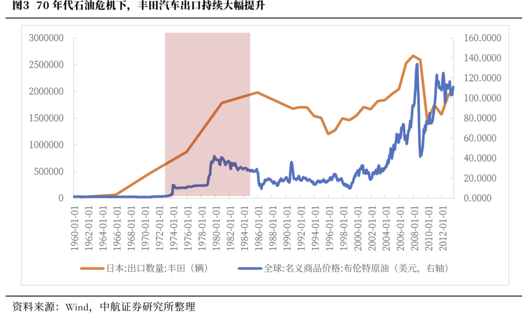结构上可关注红利板块和新能源板块。其中,新能源板块,一方面,全球能源转型和可再生能源发展本是大势所趋;另一方面,高企的油价会引发各国能源安全考虑,倒逼能源转型加速需求,利好全球新能源产业发展。以70年代石油危机时期为例,彼时油价快速上行并在高位震荡,低油耗需求推动下,日本丰田车受到消费者青睐,出口数量在70年代快速上涨。