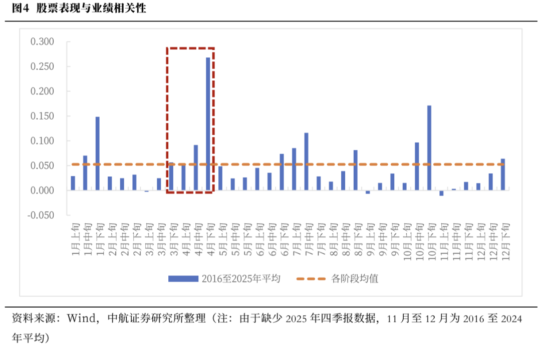 历史数据显示,4月股价与业绩相关性为全年中最高,当前市场已逐步进入财报密集发布期,关注具有基本面业绩支撑的方向。我们通过计算全市场个股各月上、中、下旬涨跌幅与单季度净利润同比的相关系数来观察不同时期市场对基本面的关注度情况。结果显示,4月是年报和一季报发布的重要时间窗口,自3月下旬相关性回升并至4月上升至全年最高峰,市场视线回归业绩。由于业绩公布期滞后于实际业绩数据,因此计算股价表现与业绩相关性时需相应的进行错位处理,将2月至4月股价表现对应一季报,5月至7月对应二季报,8月至10月对应三季报,11月至1月对应四季报。结果显示,2016年至2025年的十年间平均来看,个股表现与业绩相关性最高的时期为4月下旬,股价表现与一季度净利润同比增速的平均相关系数达0.268。