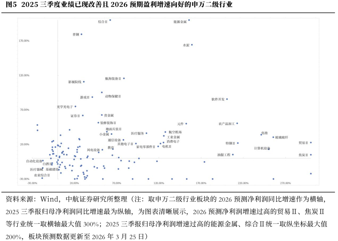 我们通过2026预测净利润同比增速和2025三季报归母净利润同比增速两个指标来寻找业绩已现改善,并且2026预期盈利有望延续向好的行业。结果显示,当前景气与未来盈利预期双高行业主要集中于新能源产业链(能源金属、电池、风电设备等)、TMT板块(元件、软件开发、计算机设备、通信设备等)以及周期资源品(工业金属、水泥、贵金属、普钢、特钢 Ⅱ等),其中可关注玻璃纤维、电池、计算机设备、软件开发、农业加工、水泥、能源金属等;而农业综合Ⅱ、基建、医疗器械、白酒等二级行业未来盈利预期和当前业绩均处于负区间,需要警惕。