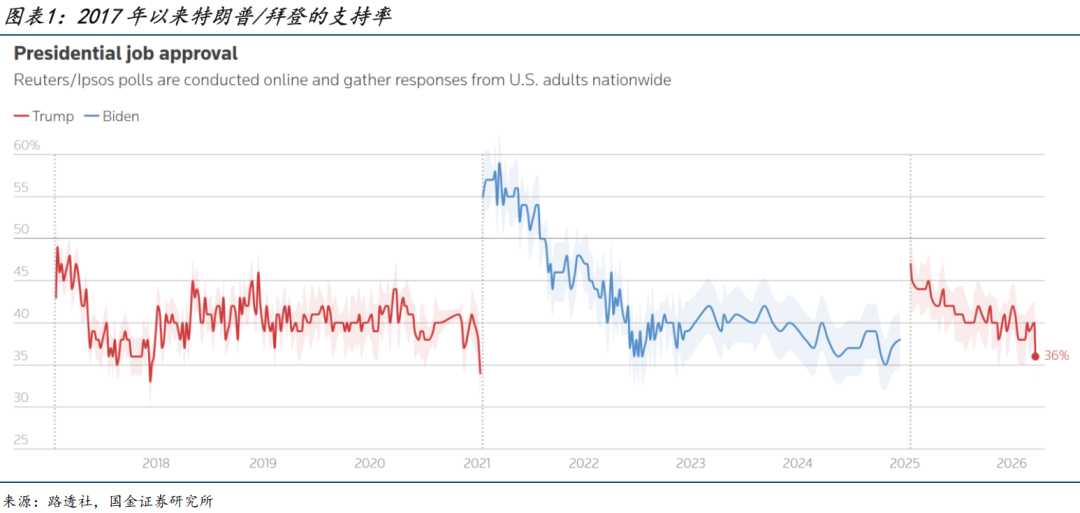 时间不在特朗普这边。油价上涨已经严重冲击了特朗普的选情,路透/益普索的最新民调显示,特朗普的支持率大幅下降至36%,创下第二任期以来的新低,持平于2020年大选共和党被横扫、2024年大选民主党被横扫之前的水平。Polymarket显示共和党在今年中选被横扫的概率上升至50%左右,至少丢失众议院几乎是板上钉钉。战争每持续一天,海峡每封锁一天,原油供需缺口就增加上千万桶,油价随时间升高,特朗普的境遇愈发不利。