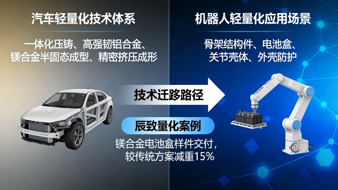 长安系旗下辰致轻量化科技已具备铝合金高压铸造、低压铸造、挤压成型及镁合金半固态成型等四大核心工艺能力。2025年底,辰致轻量化成功向四川天链机器人股份有限公司交付首批人形机器人镁合金电池盒样件,较传统铝合金方案减重15%以上,并解决了镁合金防腐和导电稳定性等核心痛点。这一案例清晰地表明:汽车轻量化技术正在向机器人领域实现高效、无缝的“技术迁移”。