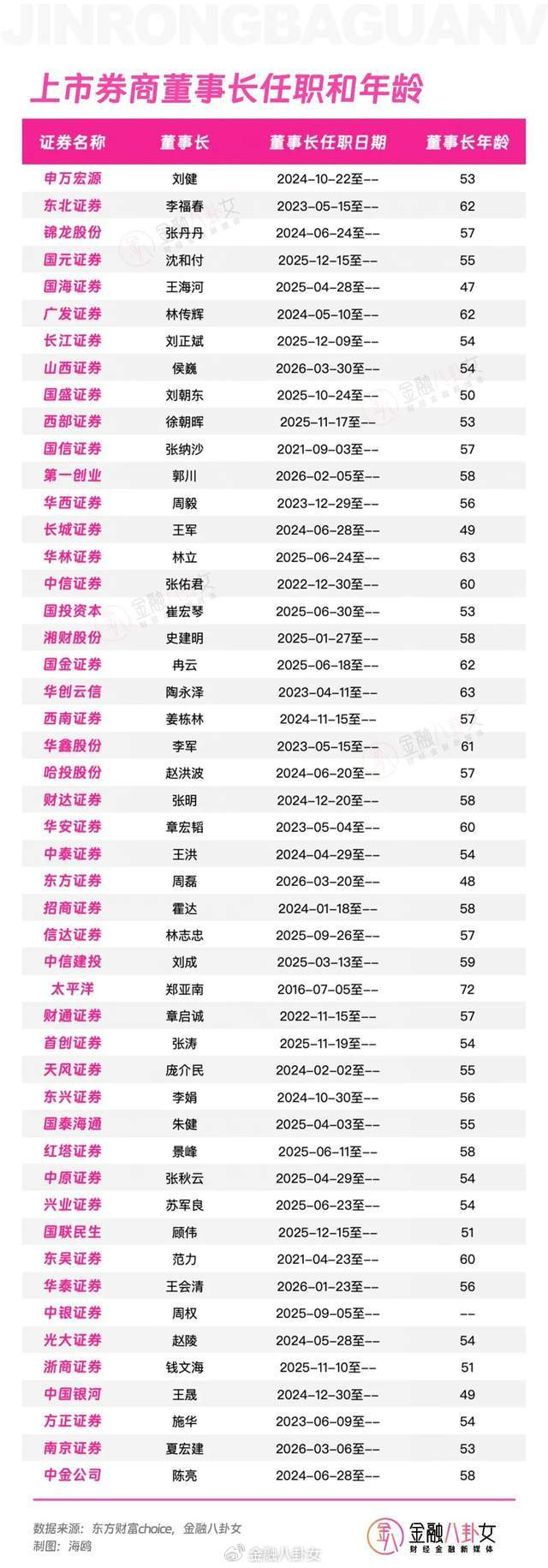 不过,这里面有一部分是换了人,也有一部分是十多二十年的老董事长,因为聘书重新下显示出来的任职日期比较近,60岁以上的董事长多数是这种情况,比如华创证券的陶永泽、东北证券的李福春、国金证券的冉云等等。