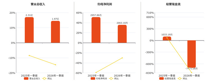 公司营业总收入为1.97亿元,较去年同报告期营业总收入减少3374.45万元,同比较去年同期下降14.62%。归母净利润为2063.10万元,较去年同报告期归母净利润减少894.75万元,同比较去年同期下降30.25%。经营活动现金净流入为-7471.26万元,较去年同报告期经营活动现金净流入减少8504.45万元,同比较去年同期下降823.13%。