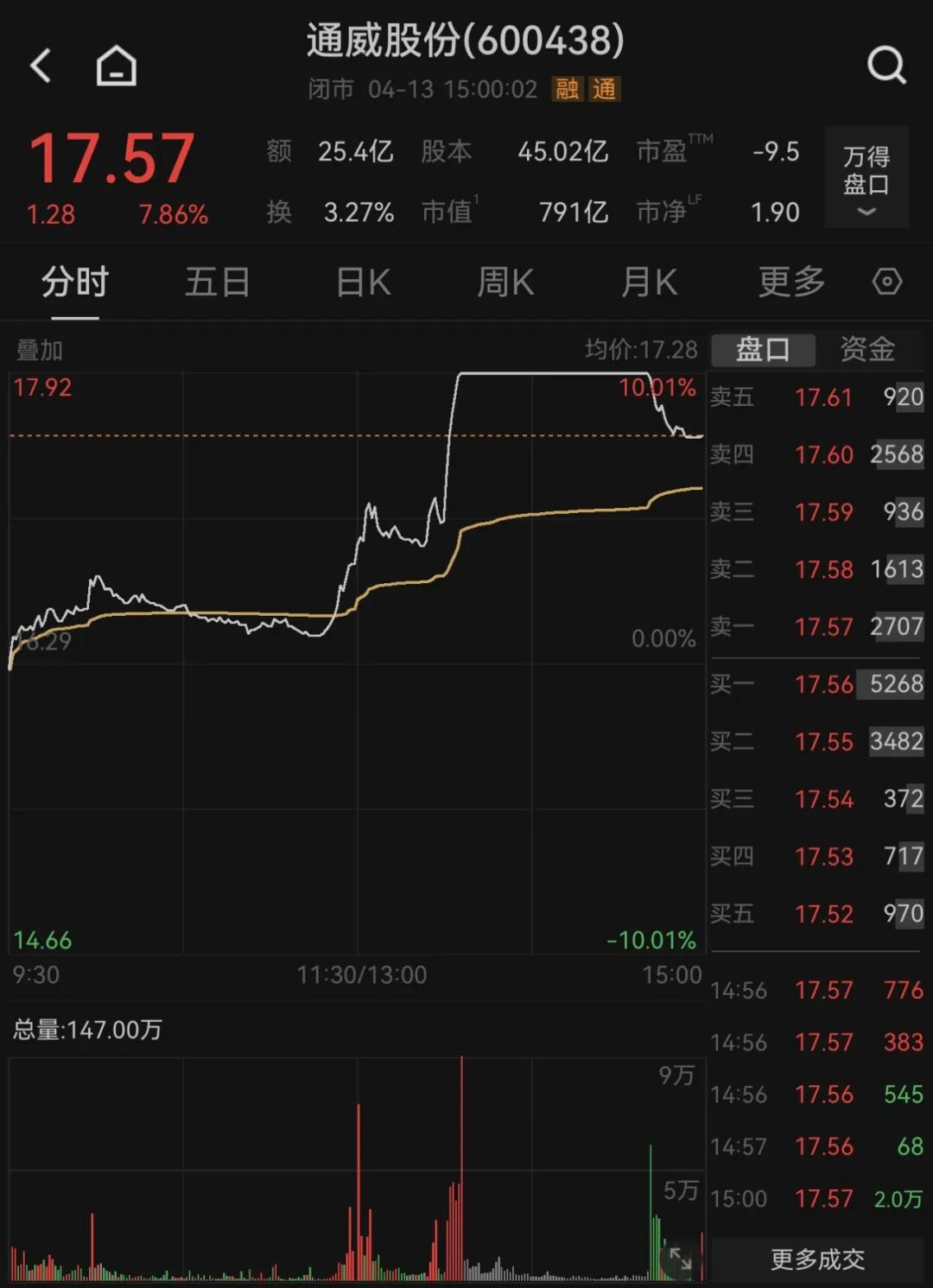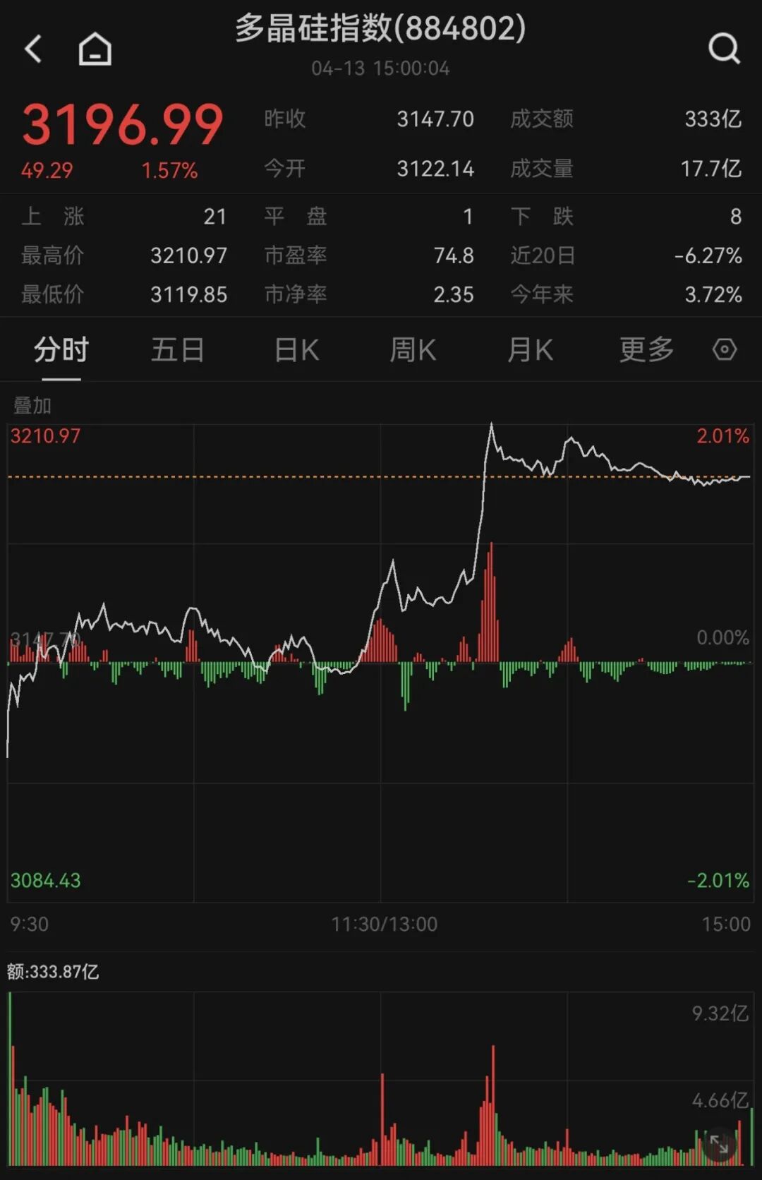 受该消息刺激,午后多晶硅主力合约直线涨停,通威股份一度封板,大全能源盘中最高涨近12%,光伏硅料板块全线走强。