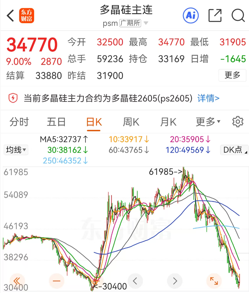 在多晶硅期货端,多晶硅期货主力合约(PS2605)4 月13 日收盘涨停,报收于34770/吨,涨幅9.00%,成交量59236 手,成交额为60.21亿元,较前一交易日显著放大。