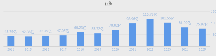 公司存货主要有原材料、库存商品,2025年公司原材料账面价值31.4亿较去年同期33亿同比下降5%;库存商品41.9亿较去年同期45.2亿同比下降7.3%;