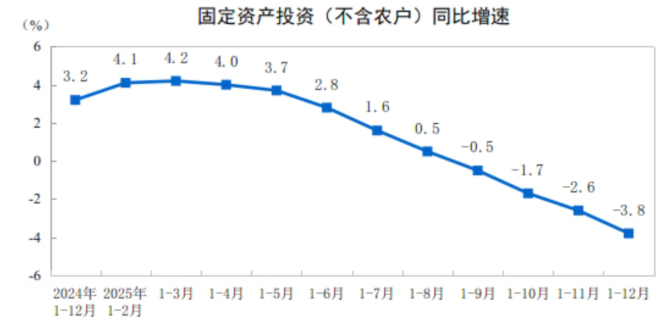 2025年,全国固定资产投资(不含农户)485186亿元,比上年下降3.8%,而且是呈逐月不断下降。同样房地产开发投资增速与全国新建商品房销售及销售额增速也是呈逐月大幅下降。