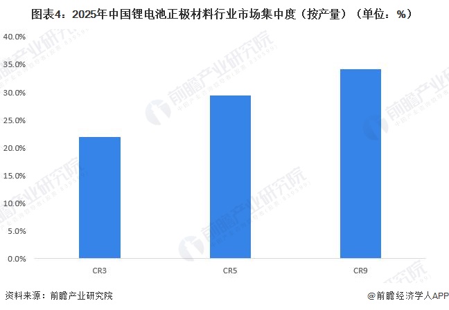 按产量,中国锂电池正极材料行业市场集中度整CR3为21.9%,CR5为29.4%,表明行业已形成具备一定规模优势的第一梯队企业,头部效应开始显现。这一数据反映出,当前行业虽已告别高度分散状态,头部企业凭借产能、技术与供应链优势逐步拉开与中小企业的差距,但行业尚未形成绝对龙头主导的格局。
