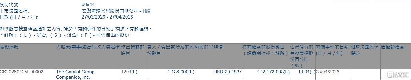 格隆汇4月27日丨根据联交所最新权益披露资料显示,2026年4月23日,海螺水泥(00914.HK)遭The Capital Group Companies, Inc.在场内以每股均价20.1837港元减持113.6万股,涉资约2292.9万港元。