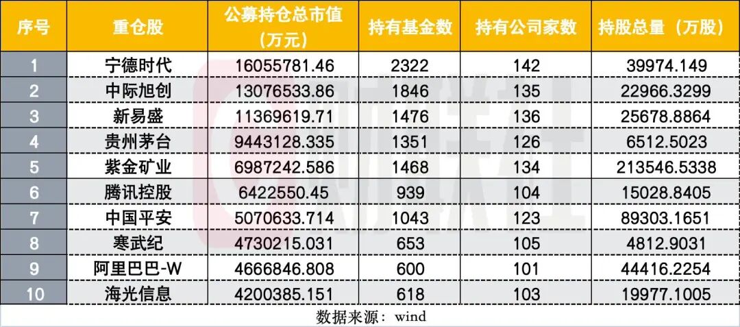 据wind统计,截至今年一季度末,公募前十大重仓股依次为:宁德时代、中际旭创、新易盛、贵州茅台、紫金矿业、腾讯控股、中国平安、寒武纪-U、阿里巴巴-W、海光信息,持仓总市值分别为1605.58亿元、1307.65亿元、1136.96亿元、944.31亿元、698.72亿元、642.26亿元、507.06亿元、473.02亿元、466.68亿元、420.04亿元。
