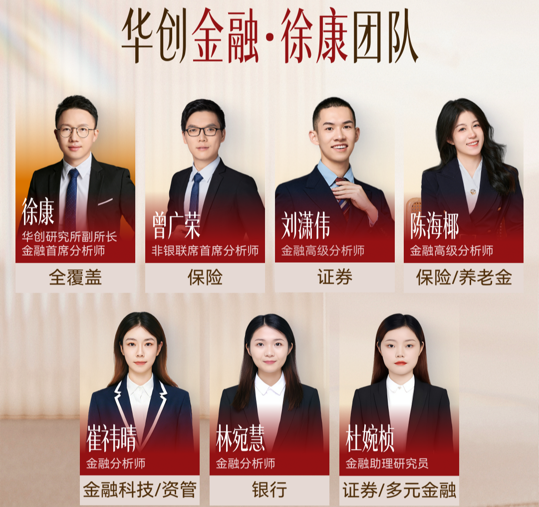 华创金融团队,按照陶总对研究业务的战略定位,华博、董总、牛博的全方位部署,我们一直笃行“最强年轻人”的策略,力争为研究所逐鹿本土最佳研究团队增砖添瓦。2025年,在潇伟、海椰、祎晴、宛慧、婉桢、贾靖等同学的共同努力下,我们已经先后斩获:证券时报·新财富最佳分析师第四/证券市场周刊水晶球第三/新浪财经金麒麟第三名/21 世纪金牌分析师第三/Choice 最佳非银分析师第一名。