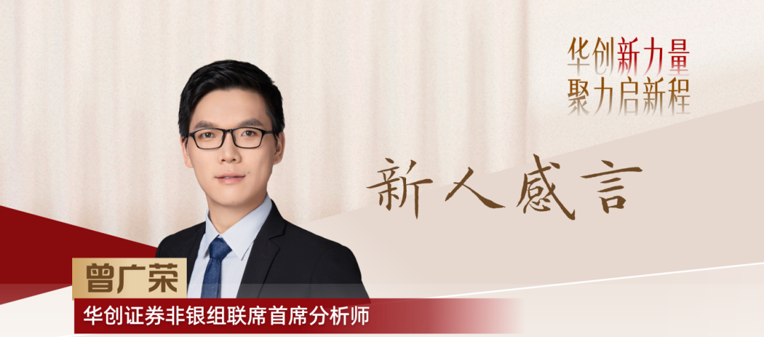 各位朋友大家好,借这个机会正式向大家报告,本人曾广荣于近日正式加入华创证券研究所,担任非银联席首席分析师,衷心感谢华创证券给我这一次宝贵的机会,感谢华中炜总、董广阳总、牛播坤总、康哥的认可,让我有幸能加入华创证券研究所这个蓬勃向上的平台。同时,也由衷感谢平安集团盛总等领导在过去一年多时间中对我的指导和支持,今后我将努力做一名靠谱的分析师,做好产业和投资之间的桥梁,不辜负领导们的期待。