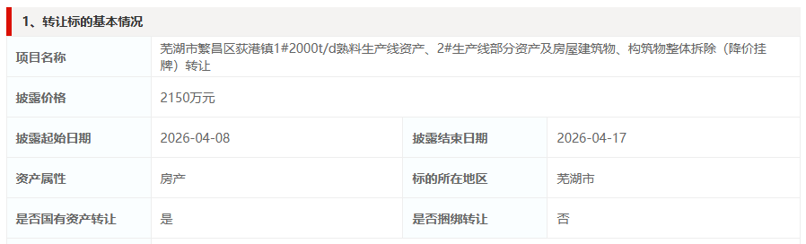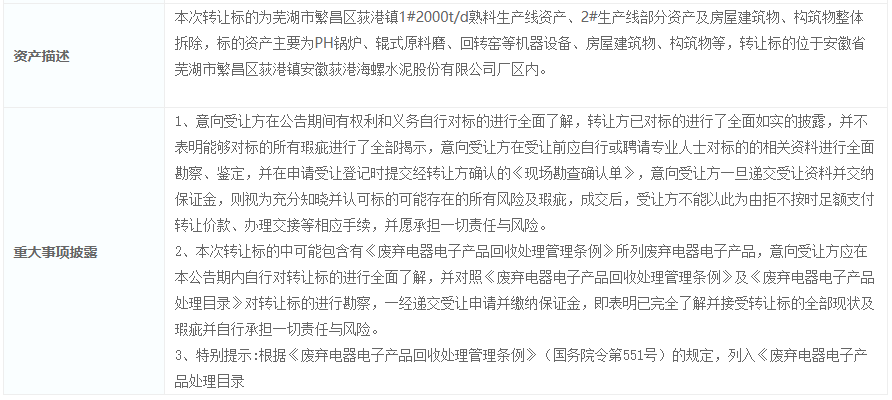 转让信息还显示,本次转让标的为芜湖市繁昌区荻港镇1#2000t/d熟料生产线资产、2#生产线部分资产及房屋建筑物、构筑物整体拆除,标的资产主要为PH锅炉、辊式原料磨、回转窑等机器设备、房屋建筑物、构筑物等,转让标的位于安徽省芜湖市繁昌区荻港镇安徽荻港海螺水泥股份有限公司厂区内。