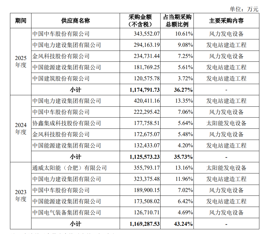 供应商方面,华润新能源前五大供应商采购共计占比分别为43.24%、35.73%、36.27%。