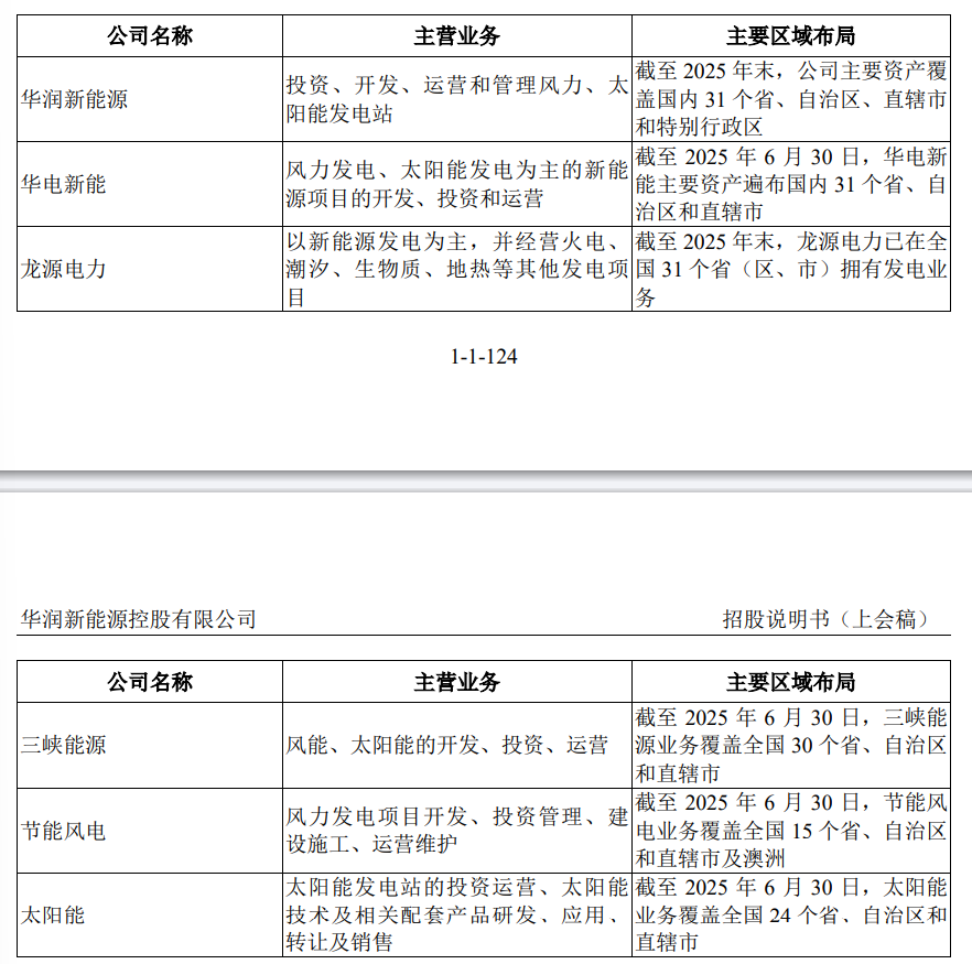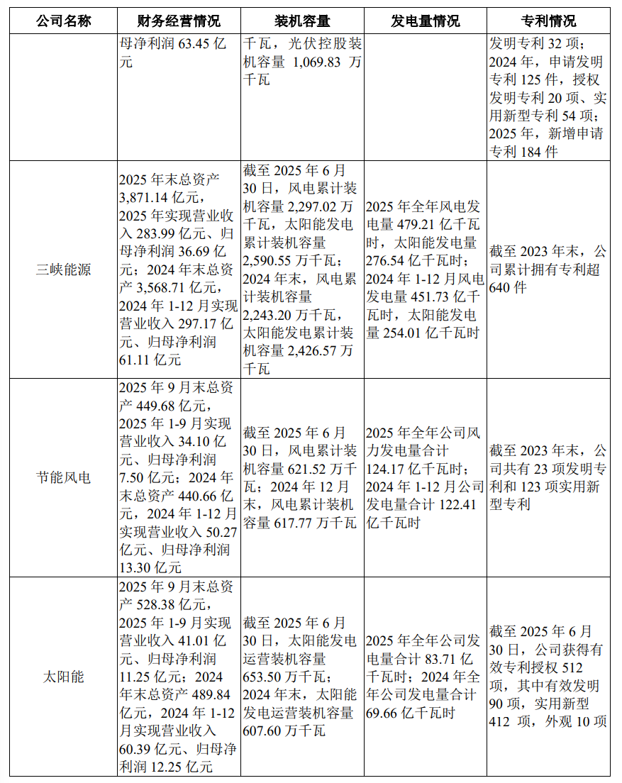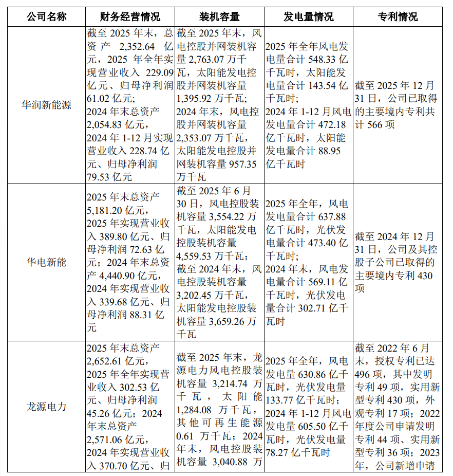 与同行业可比公司相比,华润新能源的优势在于全国性的区域布局、风电业务稳定的盈利表现及较高的专利储备;但在总资产规模、风光装机容量、发电量等核心经营指标上,均显著弱于华电新能、龙源电力、三峡能源等头部企业,整体规模处于行业中下游水平。