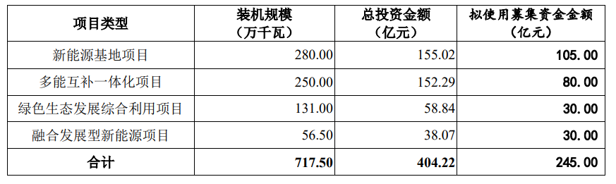 募资资金方面,本次募投项目合计装机规模717.50万千瓦,总投资404.22亿元,拟使用募集资金245.00亿元,资金主要投向新能源基地、多能互补一体化、绿色生态发展综合利用及融合发展型新能源项目。