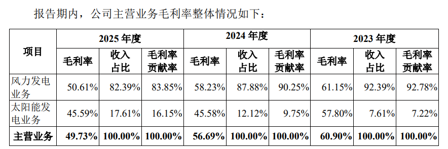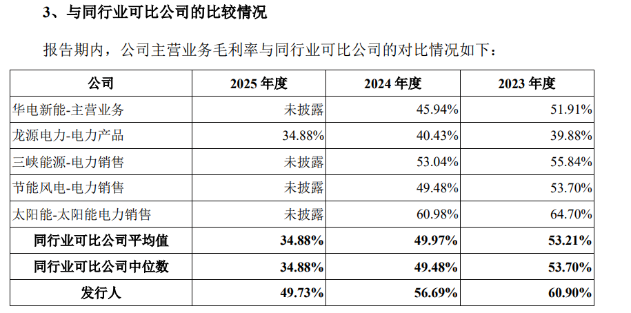 2023-2025年,华润新能源主营业务毛利率持续高于同行业可比公司的平均值与中位数,分别为60.90%、56.69%、49.73%,而同期行业平均水平为53.21%、49.97%、34.88%,中位数为53.70%、49.48%、34.88%,华润新能源毛利率虽逐年下滑,但始终保持行业领先水平。