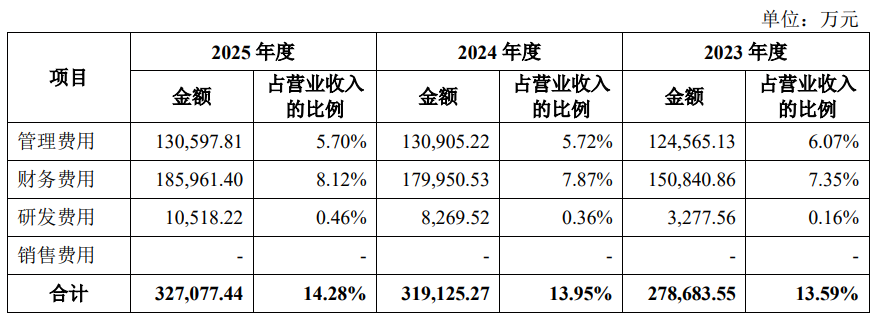 2023-2025年,华润新能源期间费用总额持续增长,从27.87亿元增至31.91亿元、再增至32.71亿元,占营业收入比例也同步由13.59%升至13.95%、再升至14.28%。